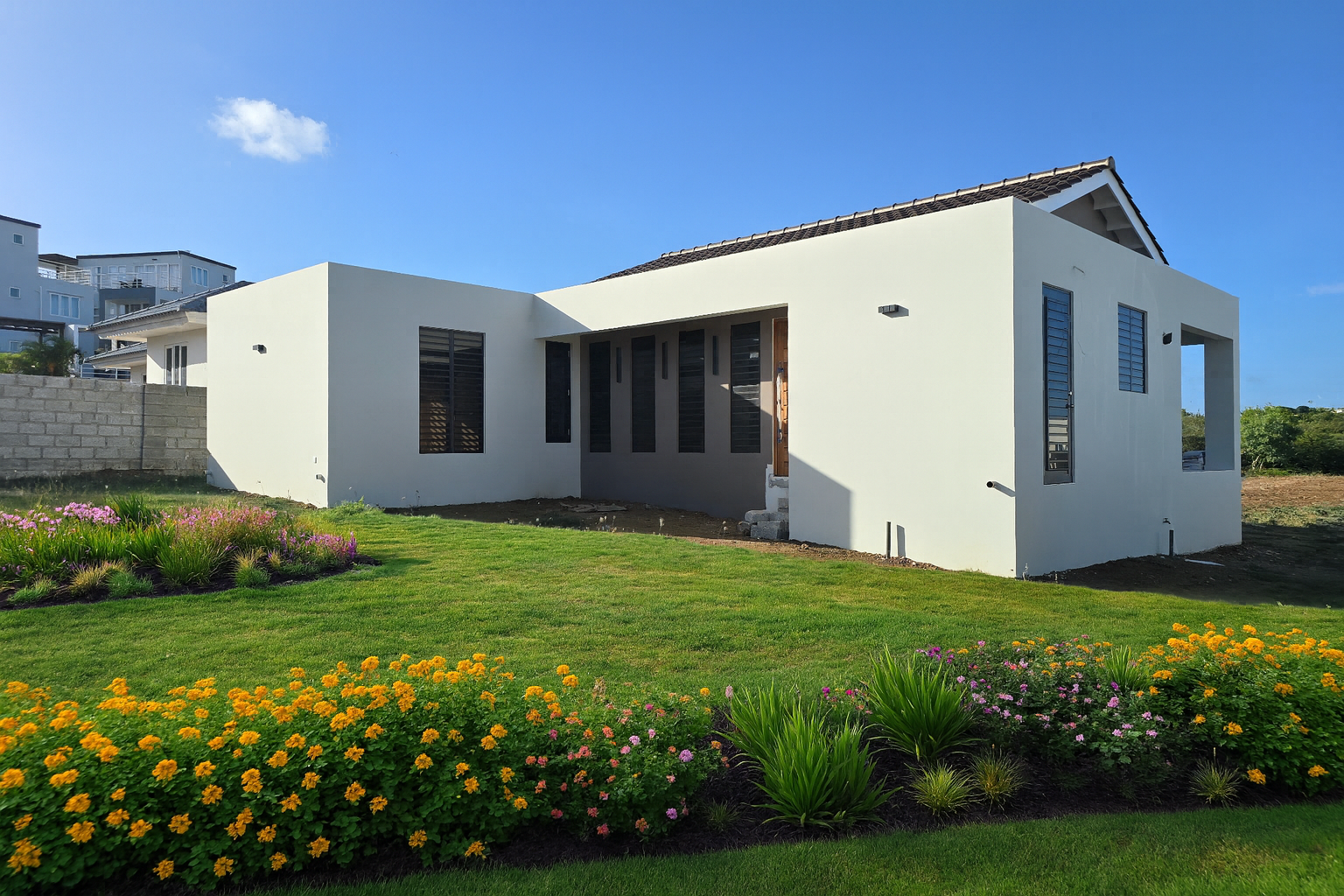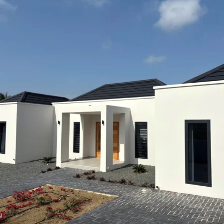 This home reflects a balance of simplicity and strength. The clean white volumes intersect with dark vertical window frames, creating a rhythmic play of light and shadow throughout the day. A warm wooden front door softens the geometric lines, inviting a natural contrast between modern form and timeless comfort. Designed with functionality in mind, the layout embraces open space and clarity, making this residence both practical and aesthetically refined.