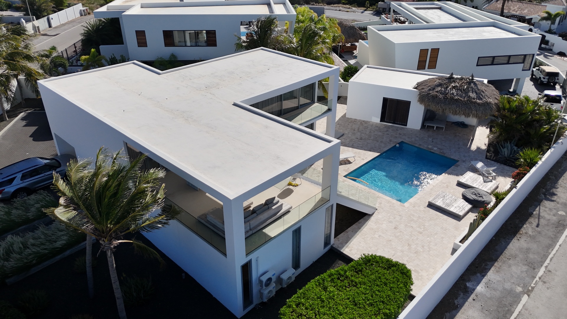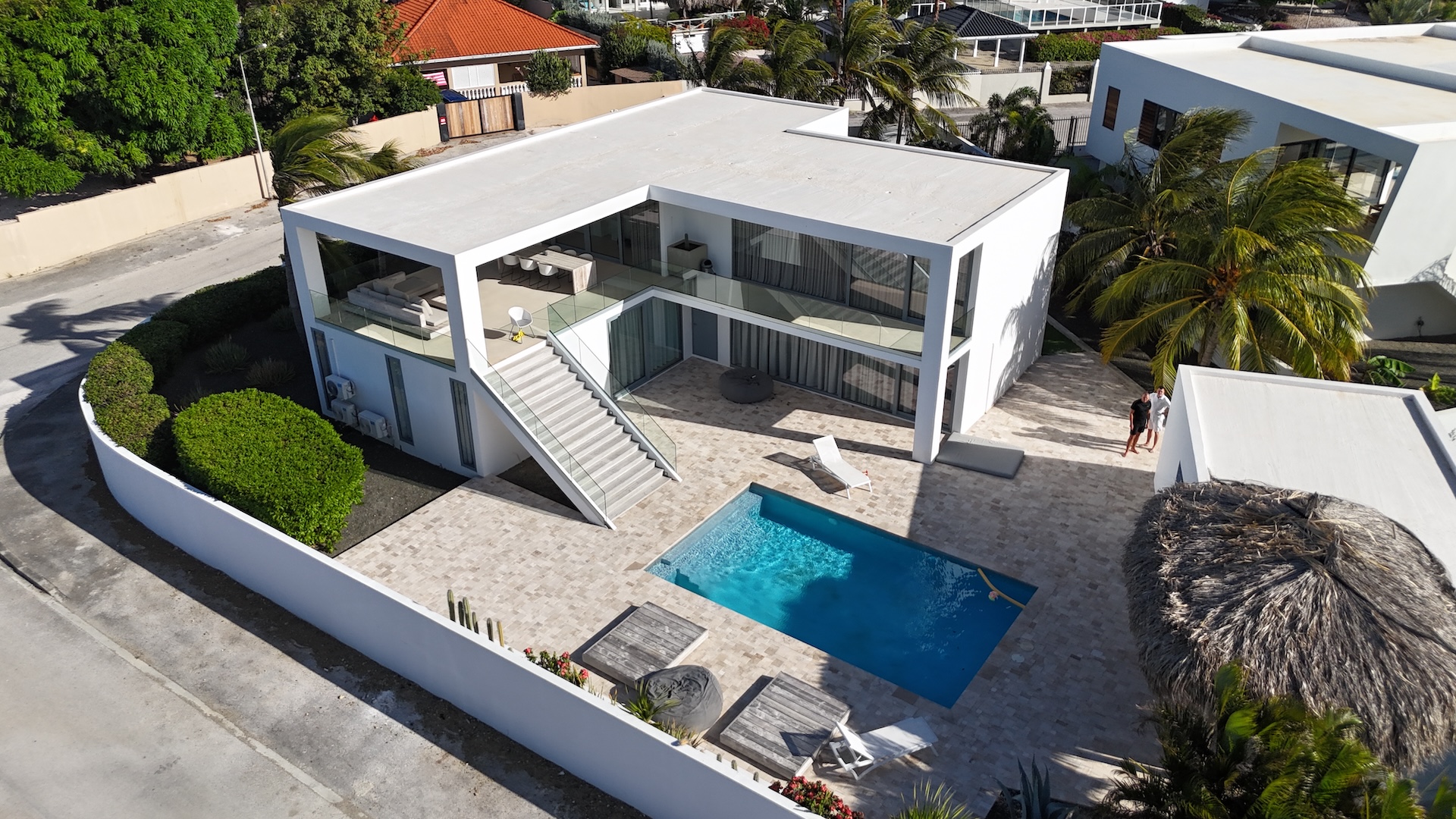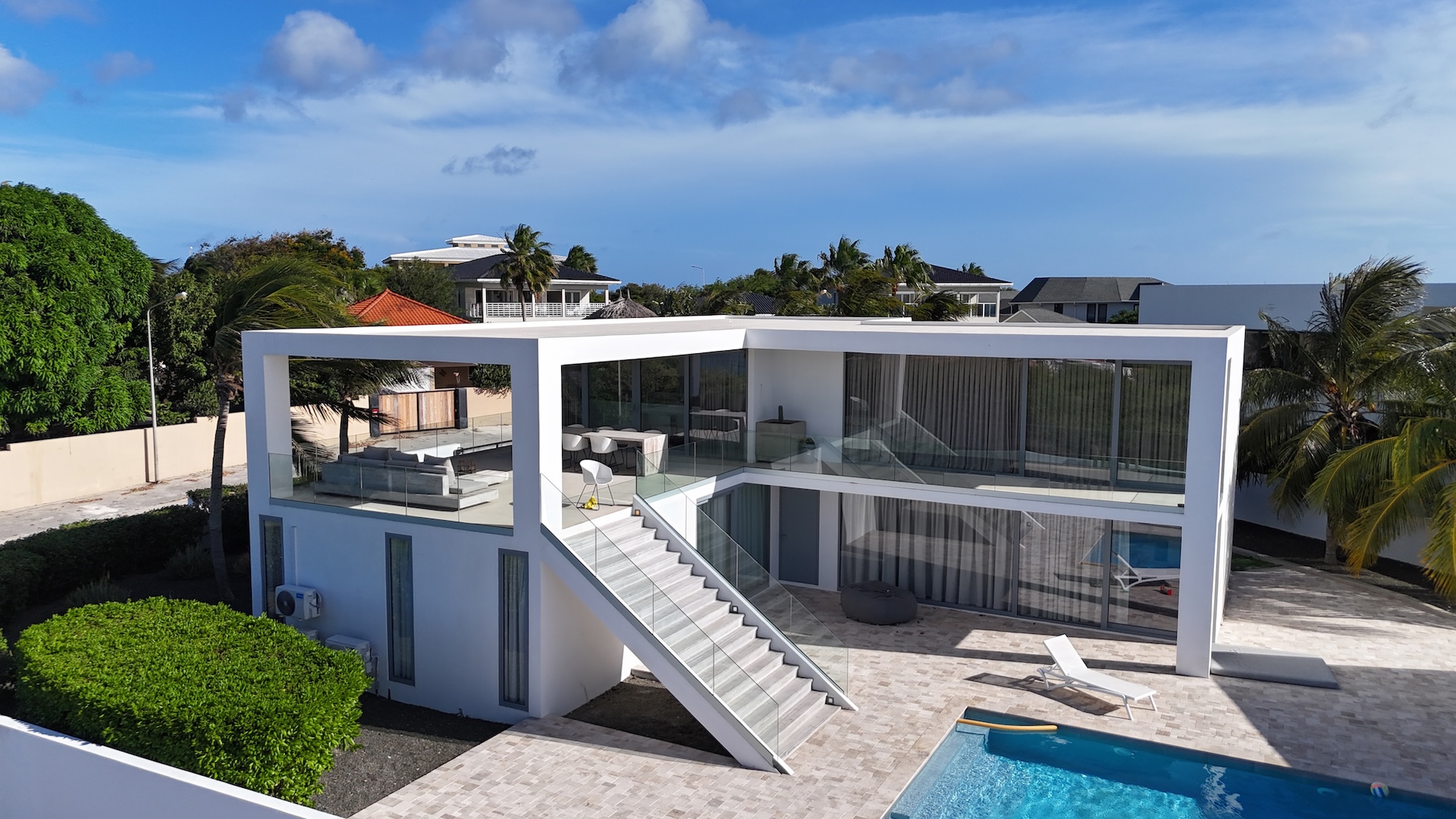 This villa embodies bold geometry and seamless openness, merging architecture with its coastal surroundings. Large glass façades invite natural light while offering uninterrupted views, blurring the boundary between indoor elegance and outdoor leisure. The cantilevered upper terrace creates a sculptural frame over the pool area, while broad staircases and clean white planes give the home a sense of contemporary grandeur. Every angle reflects a dialogue between light, space, and the tropical environment.
